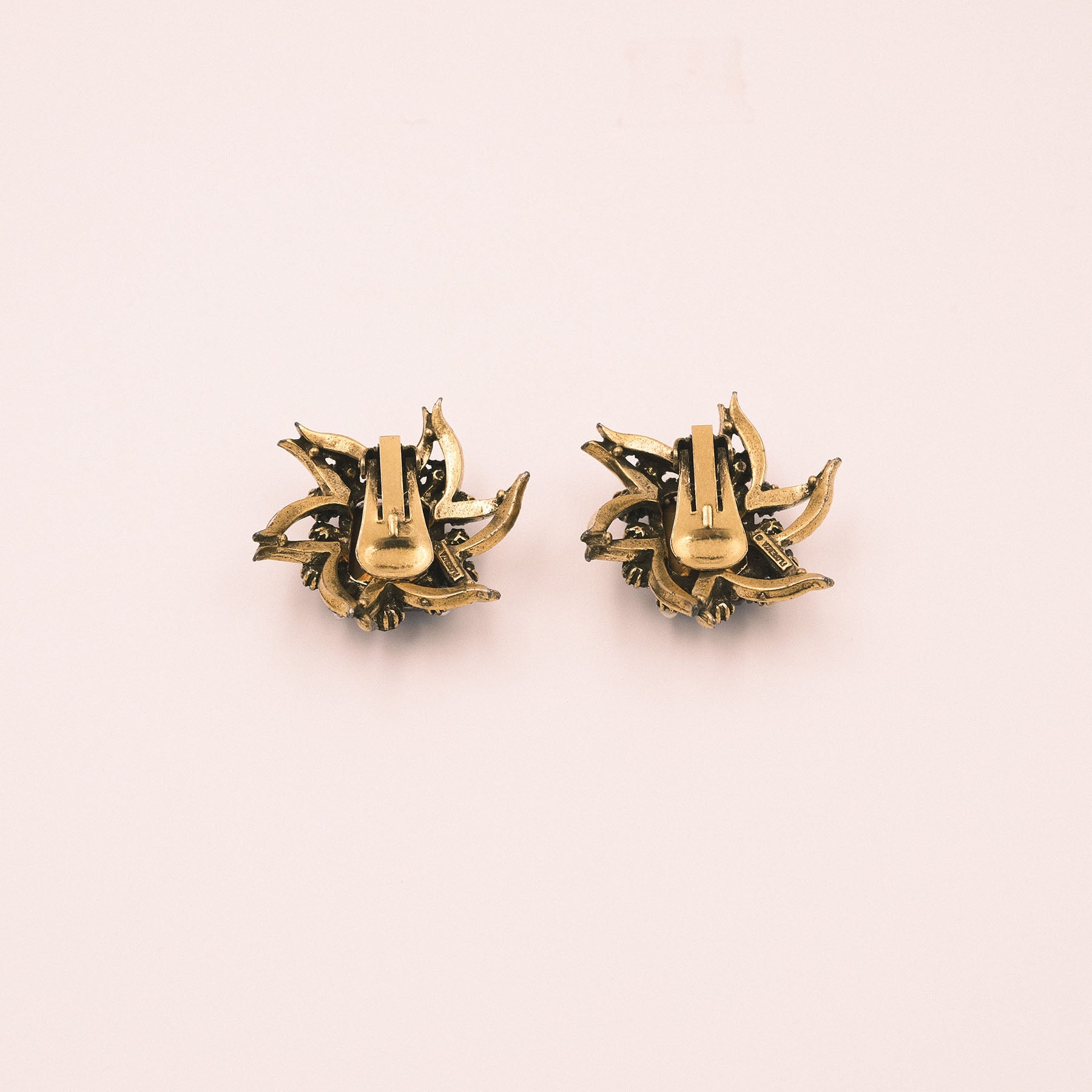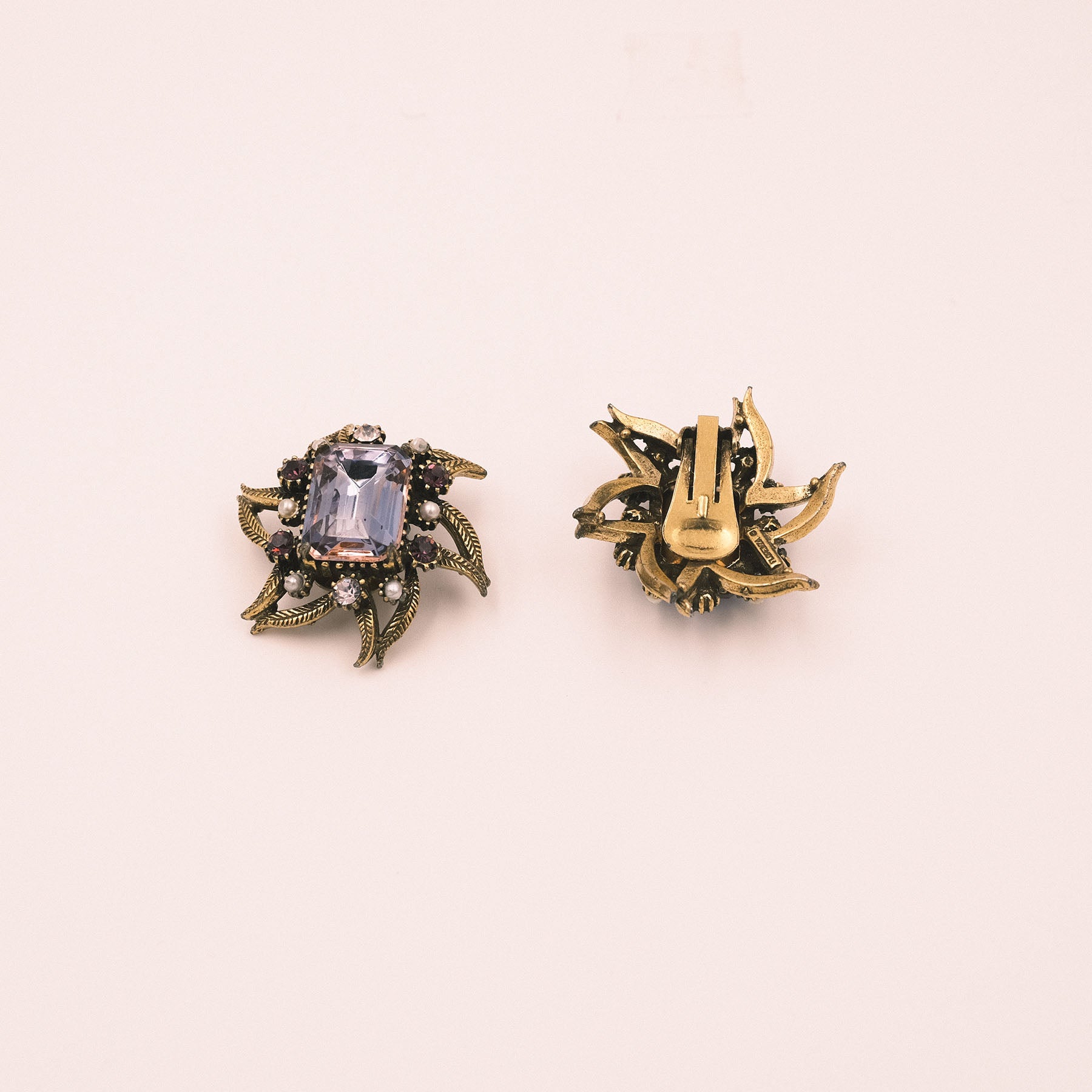 Orecchini a clip marcati Florenza sui toni del color ametista. Marchio visibile sul retro. Ottimo stato della doratura e delle pietre.