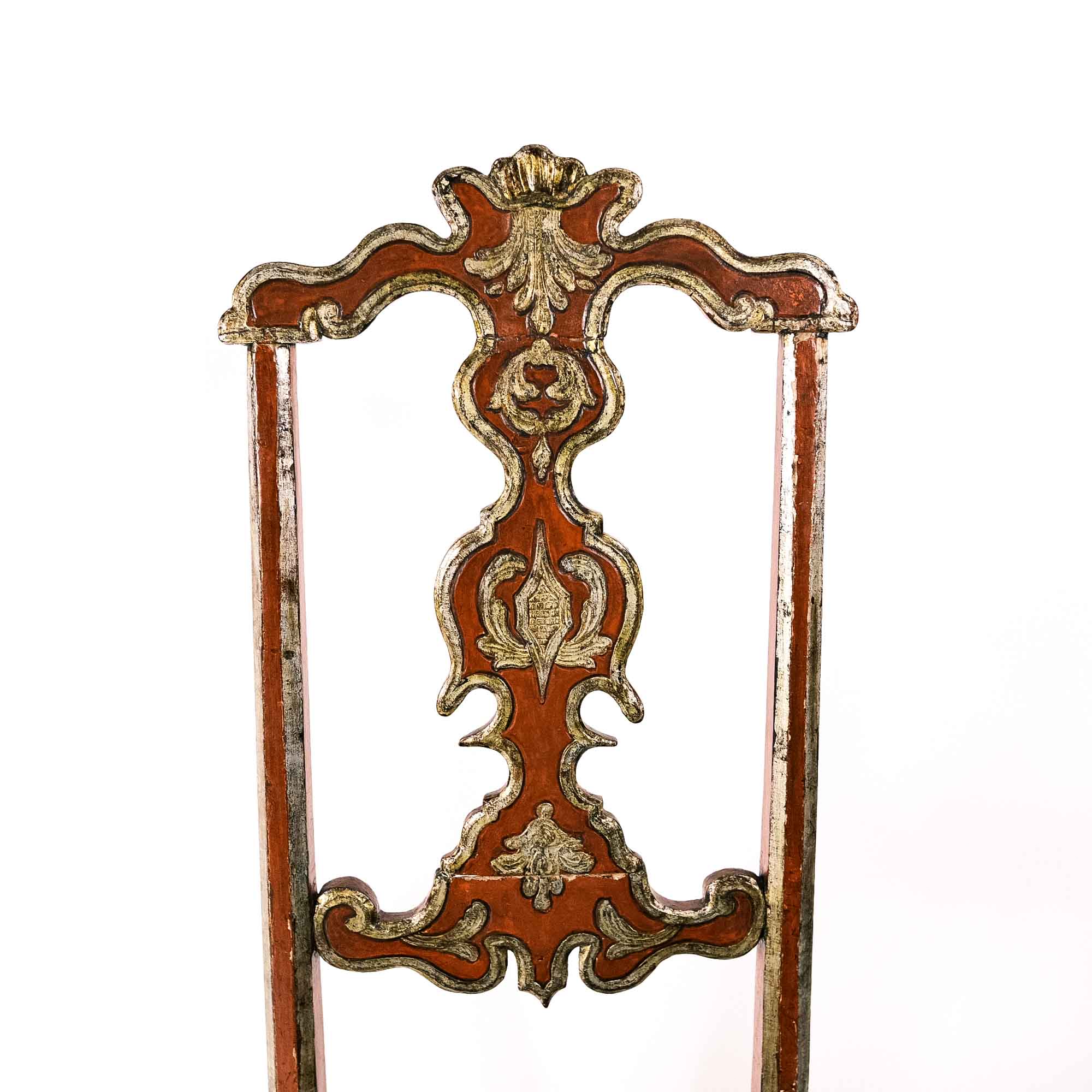 Una di sei sedie Luigi XIV in legno laccato con decorazioni a mecca e seduta in paglia. Perfette da abbinare anche ad un tavolo moderno. Ottimo stato, lievi imperfezioni dovute all'epoca.
